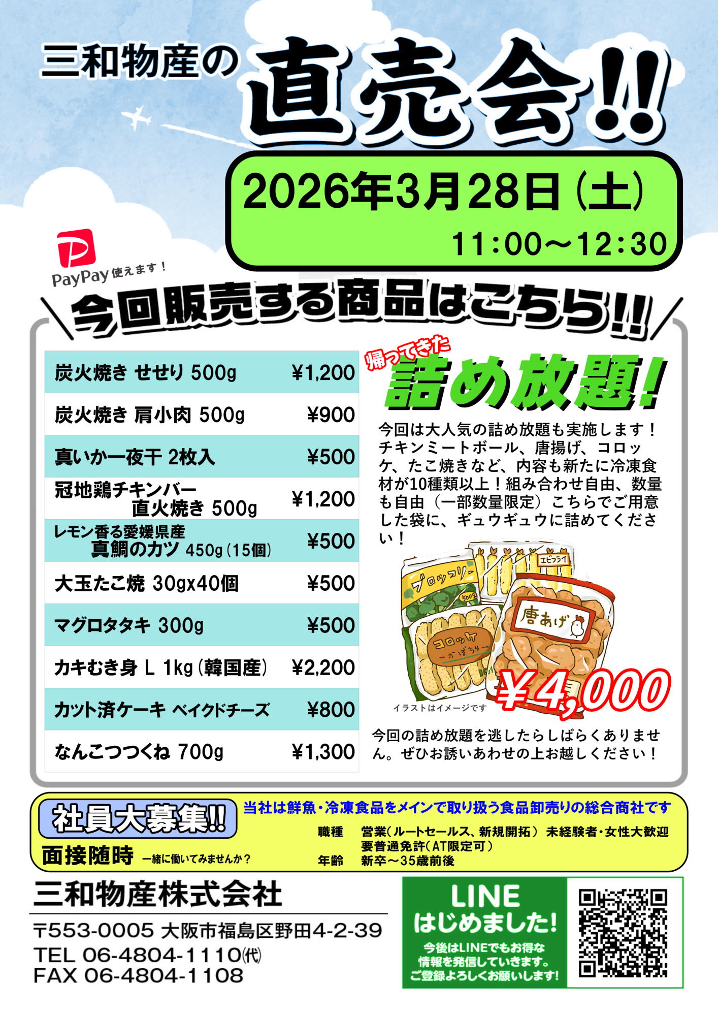 2026.03.23 お知らせ 2026年3月 直売会のお知らせ 2026年3月28日(土)11:00~12:30 大阪本社にて毎月行われている直売会のお知らせです。今回も業務用商品を扱っている、弊社ならではのお買い得品を多数用意しております。また不定期で行われる詰め放題も開催予定です。お誘い合わせのうえ、ご来場をお待ちしております。場所:三和物産株式会社 大阪本社大阪府大阪市福島区野田4丁目2−39 Googleマップ 拡大 トップ お知らせ 2026年3月 直売会のお知らせ