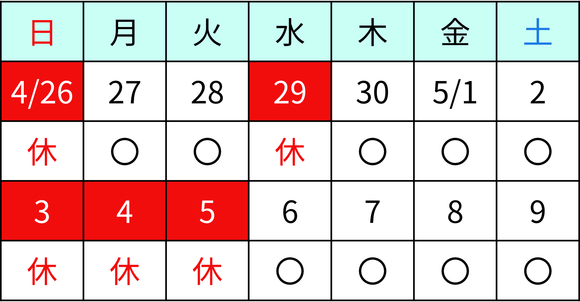 休業日:4月29日(水)、5月3日(日)~5日(火)