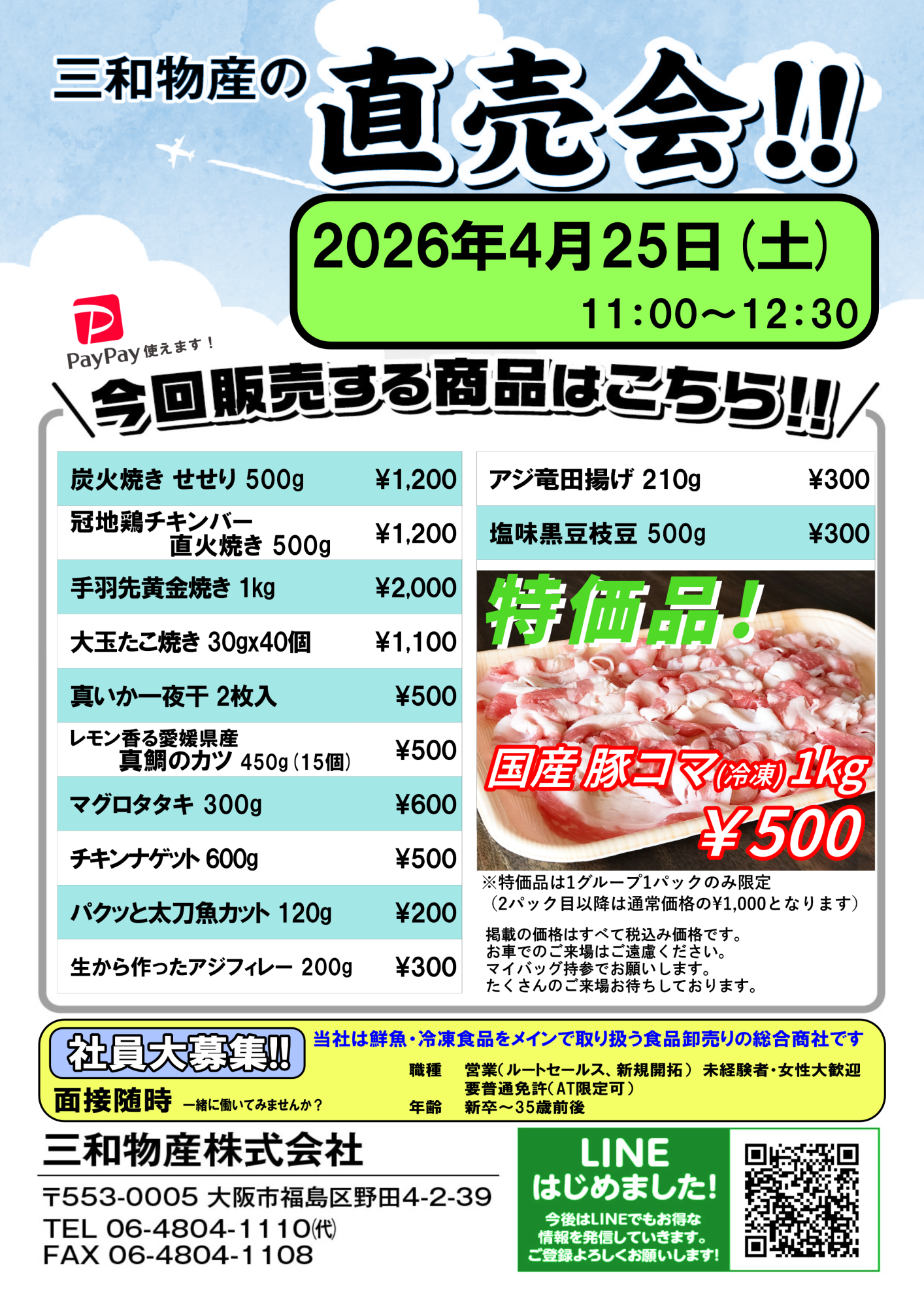 2026.04.20 お知らせ 2026年4月 直売会のお知らせ 2026年4月25日(土)11:00~12:30 大阪本社にて毎月行われている直売会のお知らせです。今回も業務用商品を扱っている、弊社ならではのお買い得品を多数用意しております。お誘い合わせのうえ、ご来場をお待ちしております。場所:三和物産株式会社 大阪本社大阪府大阪市福島区野田4丁目2−39 Googleマップ 拡大 トップ お知らせ 2026年4月 直売会のお知らせ