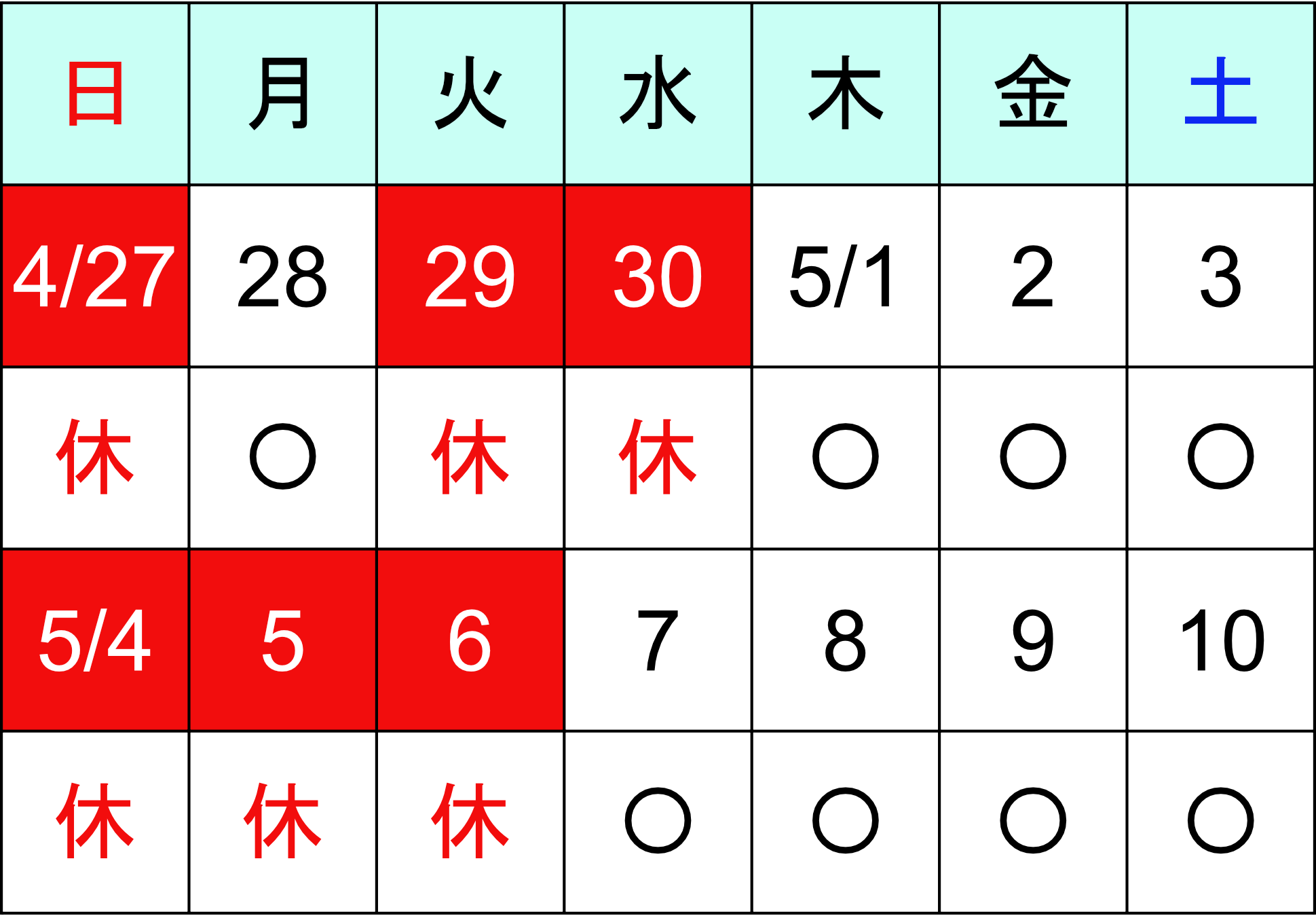 弊社のゴールデンウィーク、及び期間内の配送につきまして下記の通りとなります。